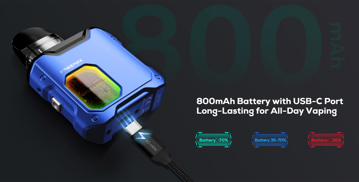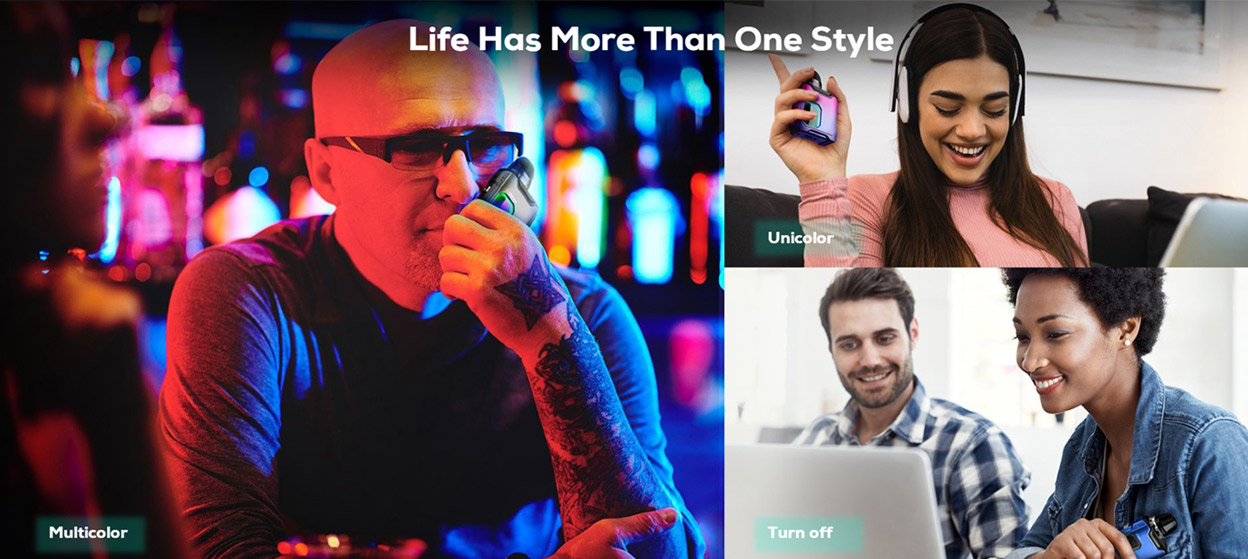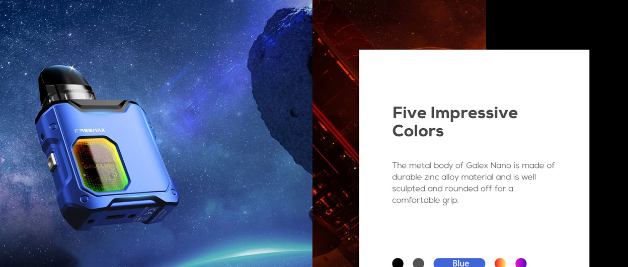 Freemax Galex Nano Kit is a box-shaped and draw-activated vape device. It features a 2ml top-filling Galex Pod and an 800mAh rechargeable Galex Nano Battery with a USB Type-C port. Galex Nano Battery supports variable wattage at three levels between 11-22W. It comes with a colorful lighting design for a shining appearance and a better interactive vaping experience. There are two modes for choices: multicolor & unicolor modes
